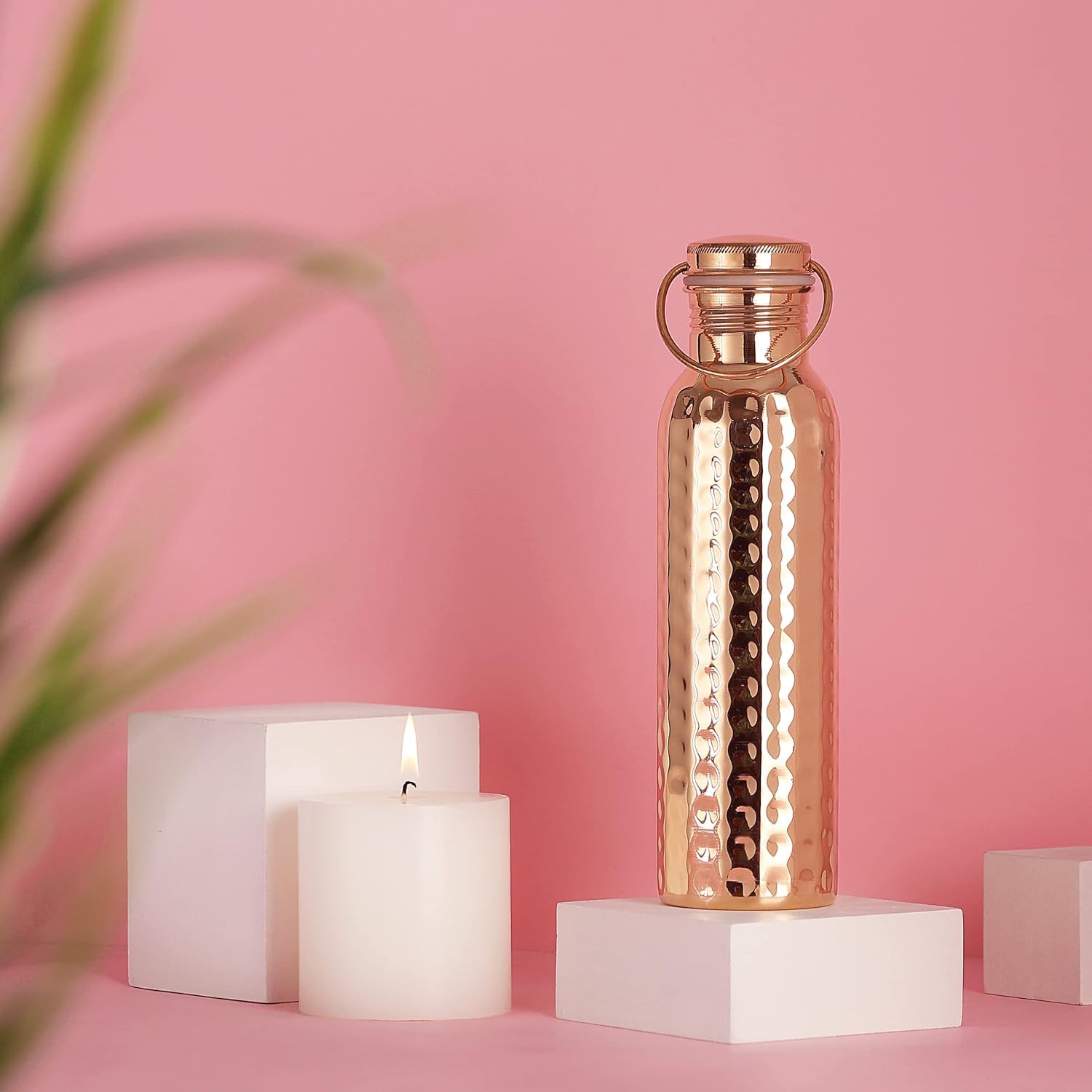 HealthGoodsAU - Pure Copper (99.74%) Hammered Water Bottle with Carrying Handle | Leakproof Seamless Water Bottle for Ayurvedic Benefits 600 Ml (20.28 Fluid Ounce)